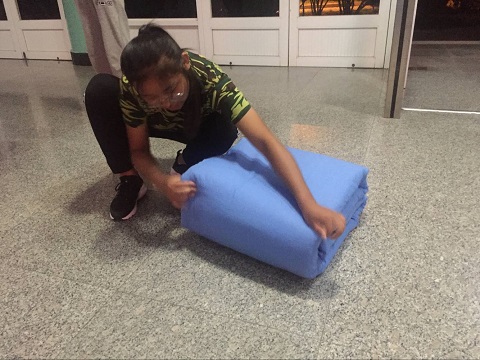 比赛采取淘汰制,分两轮进行评比。第一轮,要求同学们须在三分钟内将军被整理完毕并予以展示。参赛选手各就各位,随着一声“开始”,各位选手立即投入 “战斗”,一抖一铺、一压一折、一叠一掐、一整一摆,每一步都利落娴熟。第一轮比赛结束后,有3名选手晋级第二轮。第二轮比赛规定选手们交换被子并在紧迫的时间内完成规定内容。现场气氛紧张而严肃,晋级选手有条不紊地进行着“平铺、横拆、画线、竖折、修边、扯角”等各个动作。经过激烈的比拼,最终,公司推选了出一名同学代表公司参加校级叠军被大赛。
