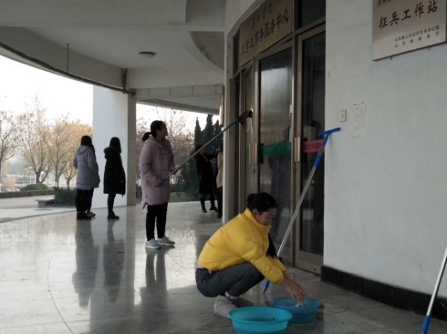 活动开始,各班负责人清点人数,传达此次任务的要求并明确各自的卫生区域。随后同学们个个铆足干劲、专心致志地擦拭每一处卫生角落。同学们不怕脏、不怕累、不怕冷,积极主动的到每个角落进行劳动,用心擦净每一点污渍。大家分工协作,有条不紊。经过近两个小时的辛勤劳作,大厅的地面和玻璃都焕然一新,大家拍拍脏兮兮的手,看着整洁的校园,脸上露出欣慰的笑容。