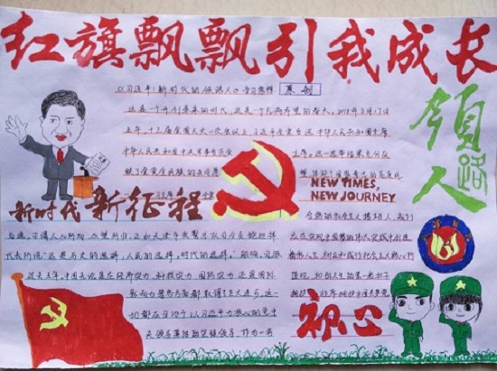 活动开始,英国be365官网社团部成员引导同学们深入学习和阅读了《习近平谈治国理政》、《习近平的七年知青岁月》、《习近平——新时代的领路人》等书籍社论文章,以及观看了两会相关视频。在加深对习近平新时代中国特色社会主义思想的理性认同、理性认同和情感认同之后,社团部成员要求同学们围绕此次学习的体会和感想,制作主题为“红旗飘飘 引我成长”的手抄报。同学们积极踊跃,将在书本中学到的知识以及阅读书目中的精句精篇以着十九大精神为主旨制作成了手抄报。手抄报类型多样,内容丰富精彩,受到了马老师的赞扬。