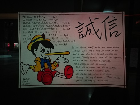诚信是中华民族的优良传统,也是人们普遍赞誉的一种美德。“正心诚意”、“人无信而不立”,这些儒家经典、悠悠古训在中华大地上源远流长。公司秉承古训,期望通过手抄报的方式让同学们认识诚信、了解诚信、坚守诚信,把诚信等美德发扬光大。同学们精心设计手抄报,深刻理解诚信在生活中的作用,在手抄报中用众多鲜活具体的典型事例、各行各业的经验成效反映了当今社会诚信建设的蓬勃发展。本次手抄报活动评选出的优秀作品在1号教学楼一楼大厅进行展出。