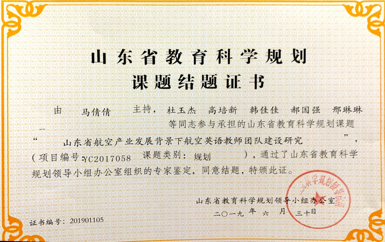 日前,马倩倩讲师主持的山东省教育科学规划课题《山东省航空产业背景下航空英语教师团队建设研究》通过了省教育科学规划领导小组办公室组织的专家鉴定,顺利结项。