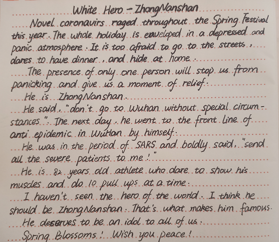 此次活动号召同学们树立正确的偶像观,围绕“春暖花开,偶像归来”的主题,用英语写一篇短文。为了向更多的人介绍自己心目中的偶像,同学们都踊跃报名了此次大赛。活动过程中,同学们纷纷表示以抗疫归来的医务人员为偶像。首先表明了以他们为偶像的原因,并且用生动形象的语言描述了偶像们在自己心目中的形象。同学们还用自己积累的扎实的语言功底和写作基础,对医护人员在前线的冲锋陷阵深刻地表达了对自己的的崇拜和感激之情。同学们的参赛作品以电子版和纸质版为主,短文形式体裁不一、句子或简单或复杂,相同的是都表达了同学们内心对偶像们的赞美之情。活动最后,根据参赛作品的语言优美程度和句式丰富程度评出名次。