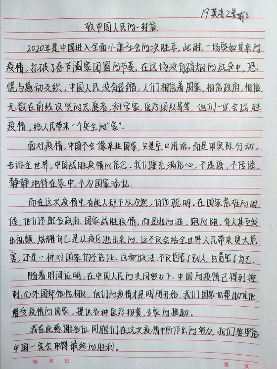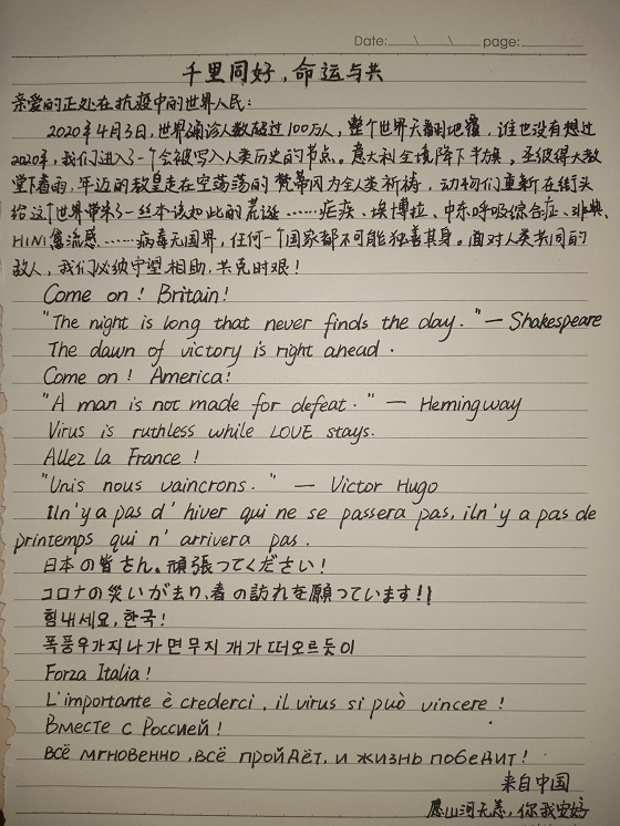 截至2020年4月,世界新冠病毒确诊人数超过100万。为号召同学们为世界各国战胜疫情加油鼓劲,培养员工命运共同体理念,4月14日至4月17日,英国be365官网开展“扁舟共济与君同”致世界人民的一封信活动。2018级、2019级部分员工参加了此次活动。