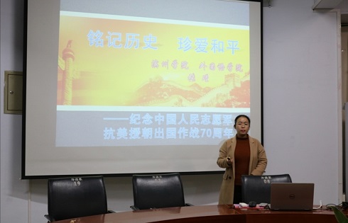 本次活动围绕“铭记历史,珍爱和平”的主题展开,党课活动上,辅导员张瑾解析抗美援朝事件的背景及意义,带领大家观看抗美援朝相关视频,向同学们介绍了该时期中国人民志愿军雄赳赳、气昂昂跨过鸭绿江,保家卫国的英雄事迹,引导党员青年感悟英雄精神,激发家国情怀。昭昭前事,惕惕后人。永矢弗谖,祈愿和平。通过本次党课活动,师生党员们接受了一次深刻而生动的爱国教育。党员同志们都深受触动,并且励志前事不忘,后事之师,自立自强,振兴中华。活动最后,辅导员张瑾号召大家以实现中华民族伟大复兴为己任,不辜负党的期望、人民期待、民族重托,立志成大才、做大事,与祖国共奋进,让青春在实现中国梦的伟大征程中焕发出更加绚丽的光彩。