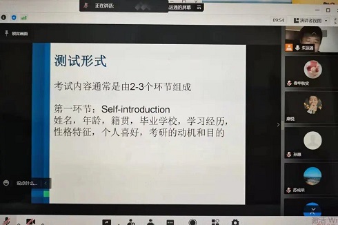 为进一步提高考研上线学子的成功录取率,持续推进“我为员工办实事”,根据《滨州公司2022年“学雷锋”志愿服务活动方案》和志愿服务专班工作的安排,3月30日晚,英国be365官网开展“青春志愿行 助力考研复试最后一公里”英语复试专题培训活动,本次培训由丰富考研指导经验的英语专业教师朱运通老师主讲,来自18个公司的考研复试学子参加活动。