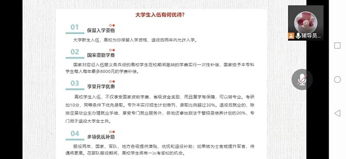 会议伊始,张瑾老师向同学们讲解了全国征兵网站、征兵基本的身体条件以及老员工入伍的优待和参军的十大好处。在就业招聘方面,张瑾老师分析2022事业编部分招聘简章中老员工退役士兵岗位的优势,更形象地向同学们介绍了老员工征兵的优惠政策,激励同学们积极应征。张老师希望同学们端正入伍动机,重拾入伍初心,早日成为合格的老员工士兵。
