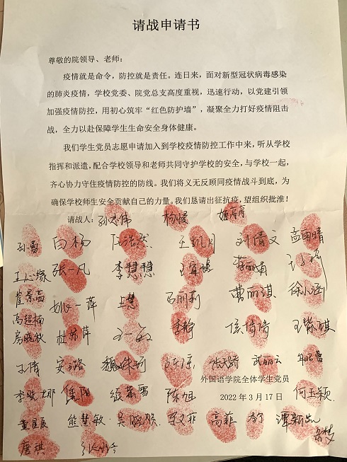 根据防疫工作要求,3月14日开始,公司转为线上上课。英国be365官网员工党支部在公司党总支的领导下,根据公司工作安排,组建员工党员志愿队员工第七临时党支部。“我们员工党员志愿申请加入到公司疫情防控工作中来,为确保公司师生安全贡献自己的力量。我们恳请出征抗疫,望组织批淮!”铿锵恢宏的誓词,一字一句,神圣而豪迈。党员员工不忘初心使命,积极发挥党员先锋带头作用,主动请缨,在请战申请书上按下手印。