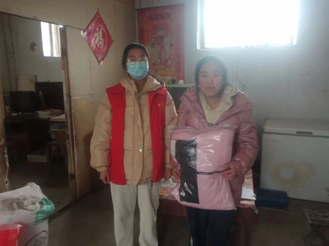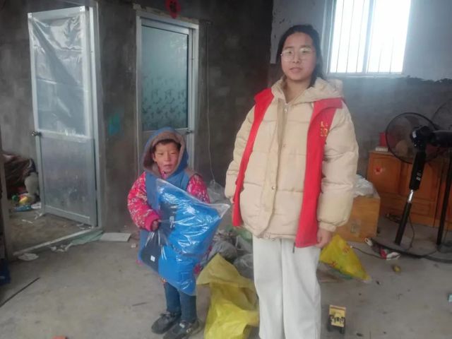 李佳莉作为志愿者,参加走访贫困家庭的活动,为他们发放羽绒服等物资。