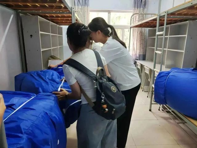 宿舍楼下,由公司老师与宿管阿姨组成的宿舍确认组协调安排新生住宿确认,为大家分发《新生住宿通知单》,为新生暖心服务,共享家的温暖。