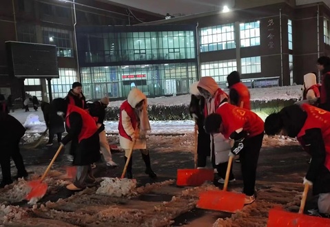 志愿者们统一着志愿者服装,领取工具后来到卫生区域,对路上的积雪进行清扫。在活动现场,志愿者们不畏严寒,纷纷拿起铁锹、扫帚等工具,投入到扫雪工作中。他们有的负责铲雪,有的负责清扫,分工明确,配合默契。在大家的共同努力下,道路上积雪逐渐被清理干净,师生们的出行安全得到了保障。