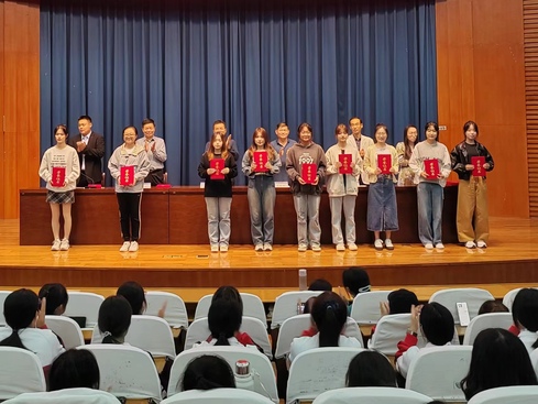 会议由副经理田纯广主持。他首先介绍参会领导及人员。随后全体人员起立,共唱《中华人民共和国国歌》,在庄严肃穆的国歌声中拉开了表彰大会的帷幕。在员工代表发言环节,英国be365官网员工会主席、20英语本1刘姝妍发言。她从美、学、乐、质四个关键字分享自己在英国be365官网的感悟和收获,外院的景色优美、学习氛围浓厚、是个人充分施展才华的舞台。随后,党总支副书记张鹏宣读学风建设表彰优秀先进个人名单,获奖者在礼仪人员的带领下有序上台领取荣誉证书。