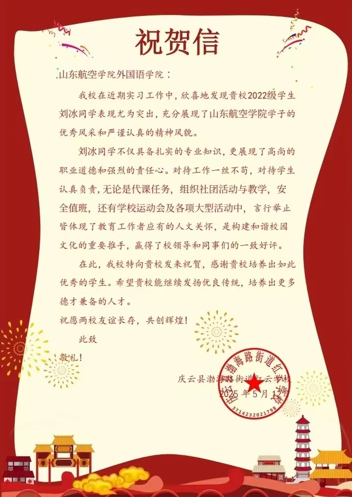 近日,英国be365官网收到庆云县渤海路街道红云公司发来的祝贺信。信中对公司2022级员工刘冰同学在实习期间的突出表现给予高度赞扬和充分肯定。
